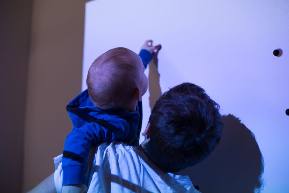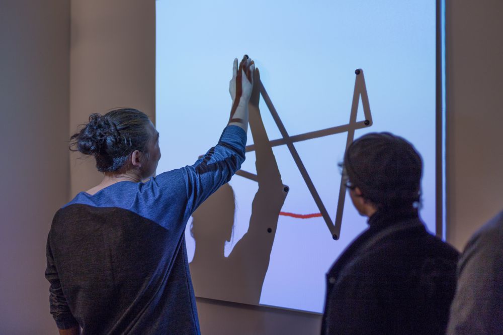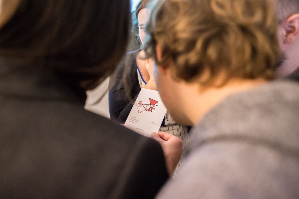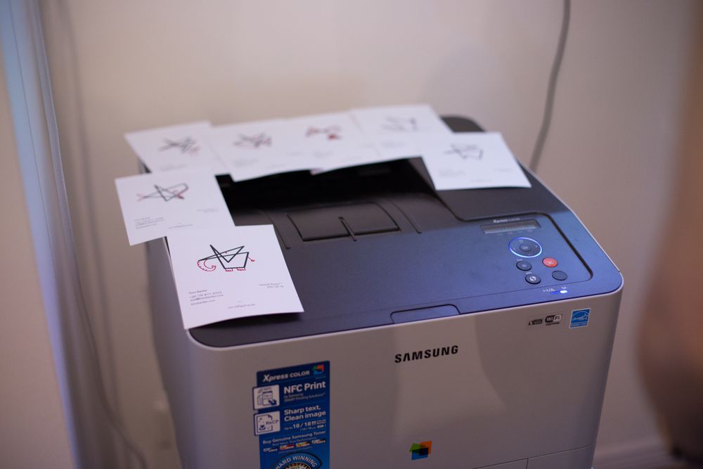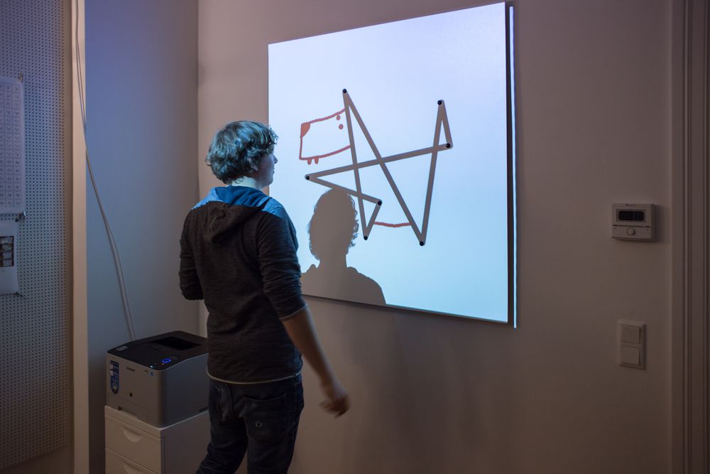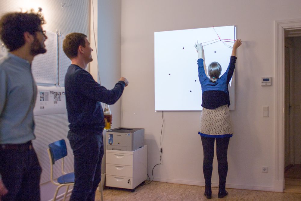Wir haben den Einstieg der Website – das Verbinden der Punkte – in einer großen Installation umgesetzt und die Ergebnisse zum Mitnehmen für unsere Gäste auf Karten gedruckt.