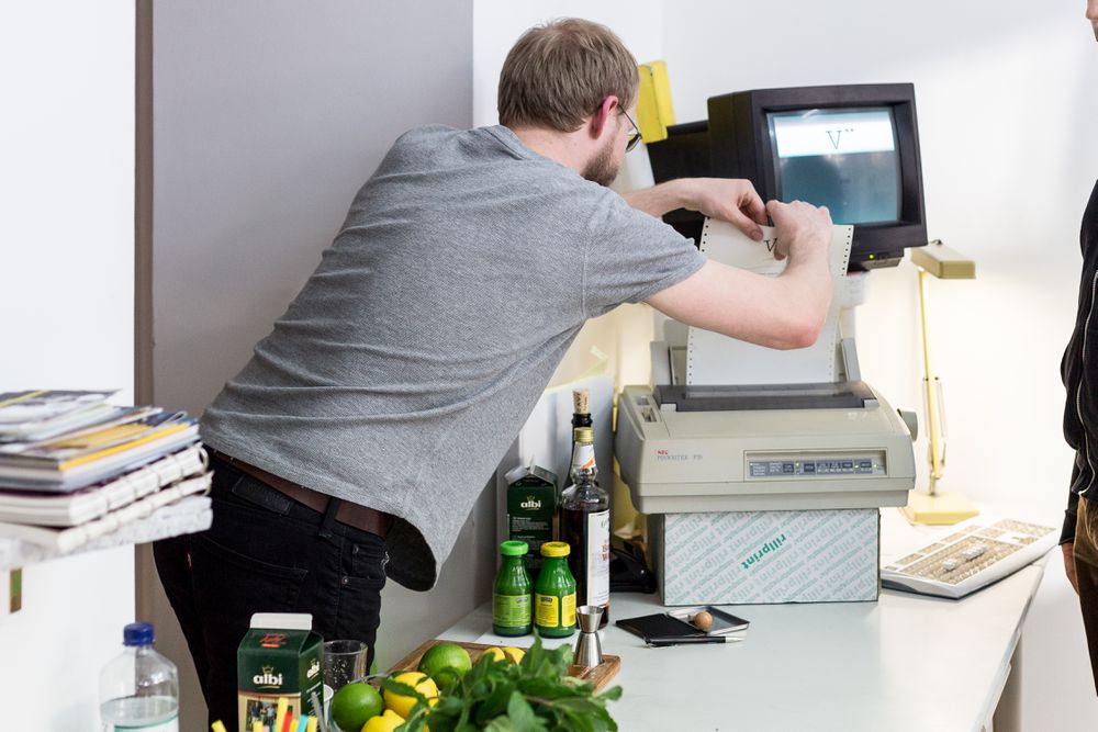 §2.2 Angenomme Zutaten werden nicht markiert.§3 Sind alle Zutaten abgestimmt, wird das Rezept automatisch auf einem NEC P20 Baujahr 1994 auf doppeltem Durchschlagpapier gedruckt.