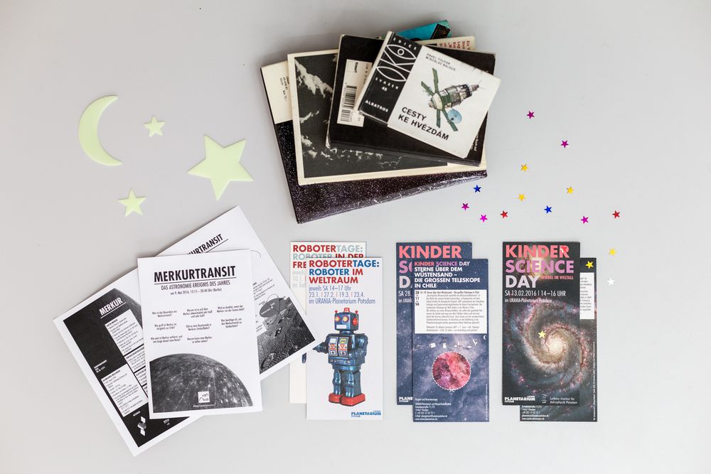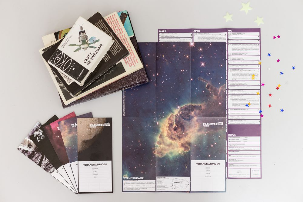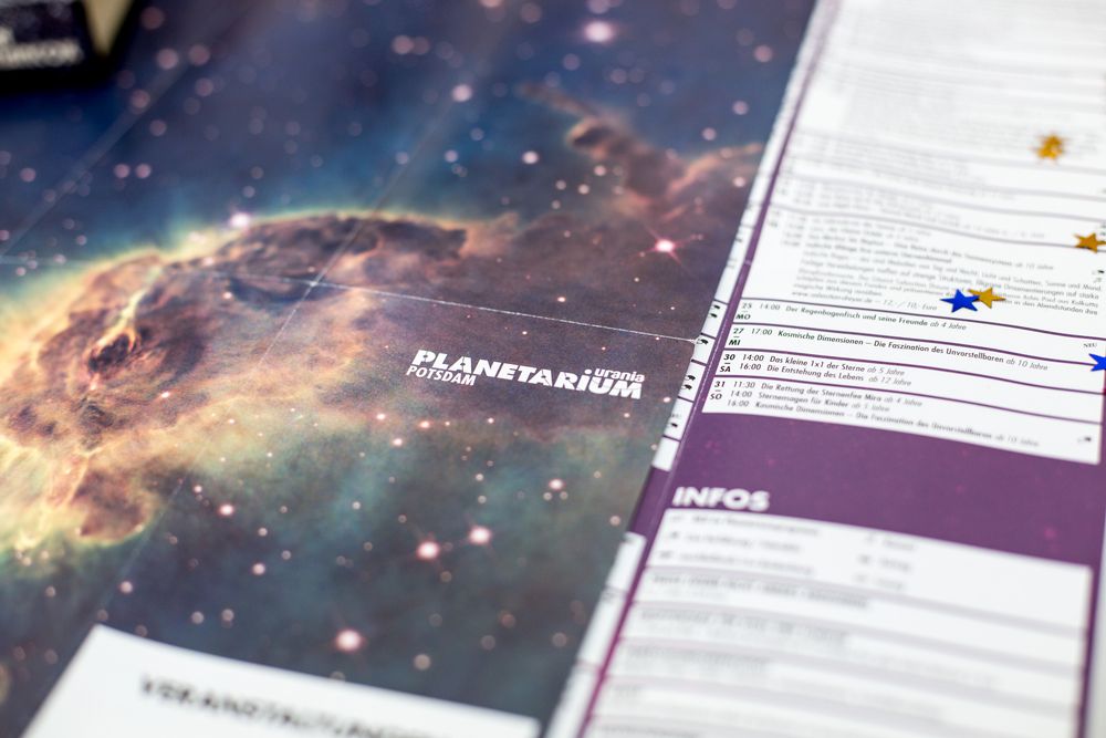 Wir haben dem Produkt Planetariumsflyer eine neue Ebene gegeben, indem wir ihn mit einem Poster verbunden haben. Zusammengefaltet erhascht man nur einen kleinen Teil des Bildes, welches Interesse weckt und zum Aufklappen verleitet. Aufgeklappt offenbart sich ein faszinierender Blick in die Tiefen unseres Kosmos.