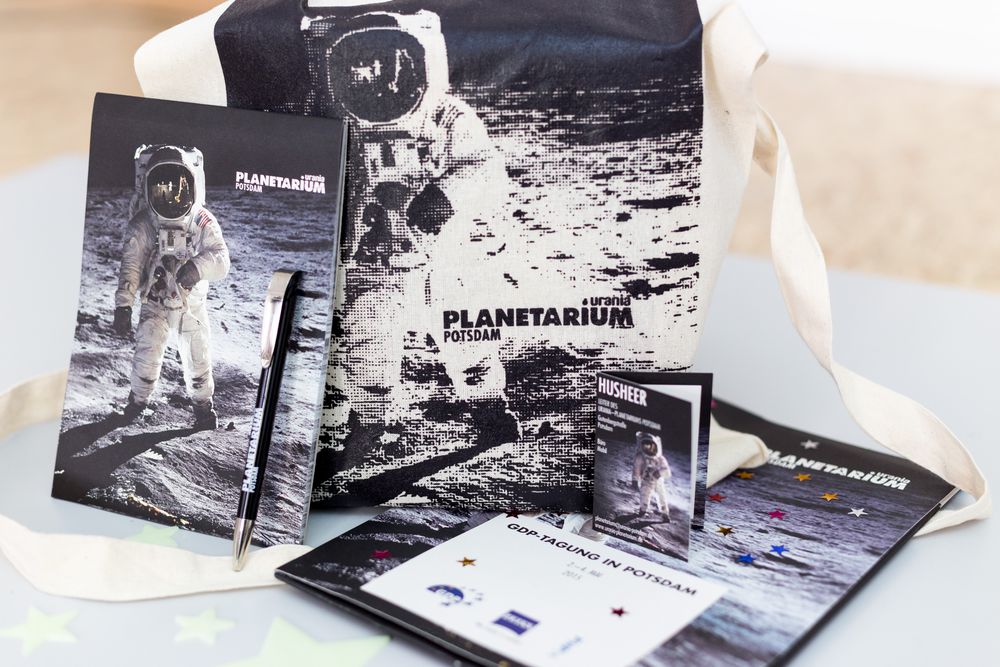 Das Start-Keyvisual, das bekannte Bild von Buzz Aldrin auf dem Mond, bildet den Einstieg in den Kosmos. Ab hier etablieren sich wechselnde Weltraumaufnahmen mit dem scheinbar schwebenden Sonnensystem-Logo im Hauptbild des Programmflyers.