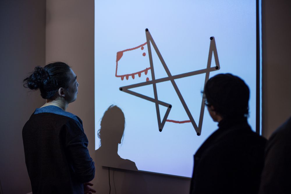Auf der Eröffnungsfeier zu der Website haben wir diesen Automatismus wiederum zu einer Installation verarbeitet. Auf einer großen Projektionsfläche konnten die Gäste Knöpfe drücken, um dann gedruckte Versionen der Illustrationen mit nach Haus zu nehmen.