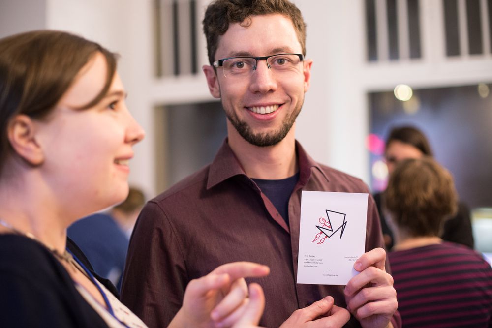- Timo reicht seine Visitenkarte mit einem schwarzen Stift und der Bitte, die Punkte zu verbinden.